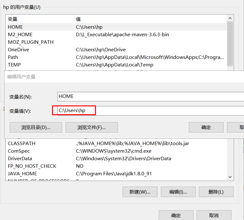 在我的电脑上 HOME 的值是 %HOMEDRIVE%%HOMEPATH% 竟然不识别。已知 %homedrive% 指操作系统所在盘默认为 C:,%HOMEPATH% 指的是用户所在目录,举例说明 \Users\zhangsan。